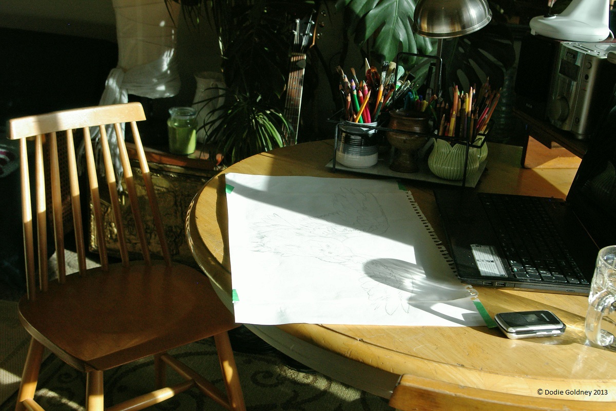 Here is where I draw and paint, plan projects, tear things apart and build them into new, other things. Here is where I sit hunched over my laptop, tinkering with photos or writings or music (or maybe just looking for Dr. Internet’s help with my creative self-diagnosing). Here is where the sewing machine goes when it’s out, and the toolbox, and the potting soil.
